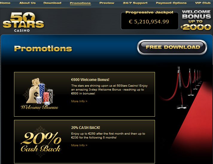 New players at 50Stars Casino are eligible for a €600 welcome package over three deposits. On your first deposit at the casino, you will be eligible for a 100% match deposit bonus up to €200. On your second deposit at the casino you will be eligible for a 125% deposit bonus up to €200 and on your third deposit at the casino you will be eligible for a 150% deposit bonus up to €300.