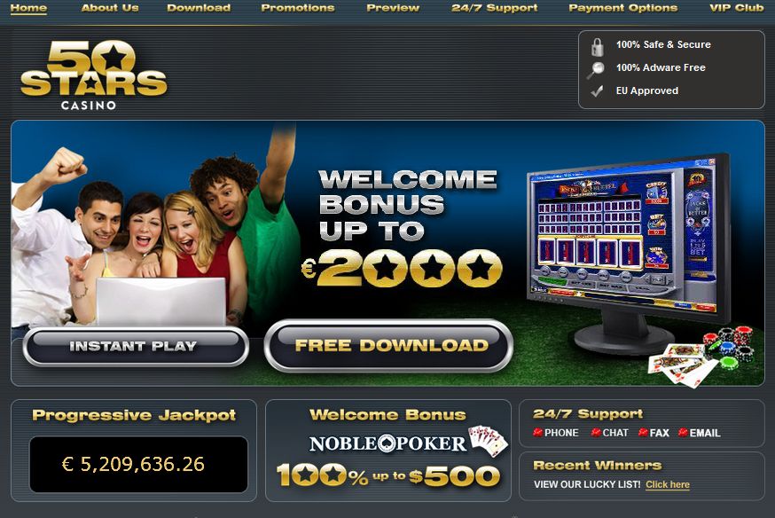 50Stars Casino is powered by the online casino software provider, Playtech. The software is available in a downloadable version, as well as a no-download instant flash version. There are plenty of games for players to choose from, including card games, table games, video poker, slots, video slots, arcade games and progressive games. Some of the games include blackjack, baccarat, red dog, European, American and pro roulette, craps, sic bo, keno, bingo and more.