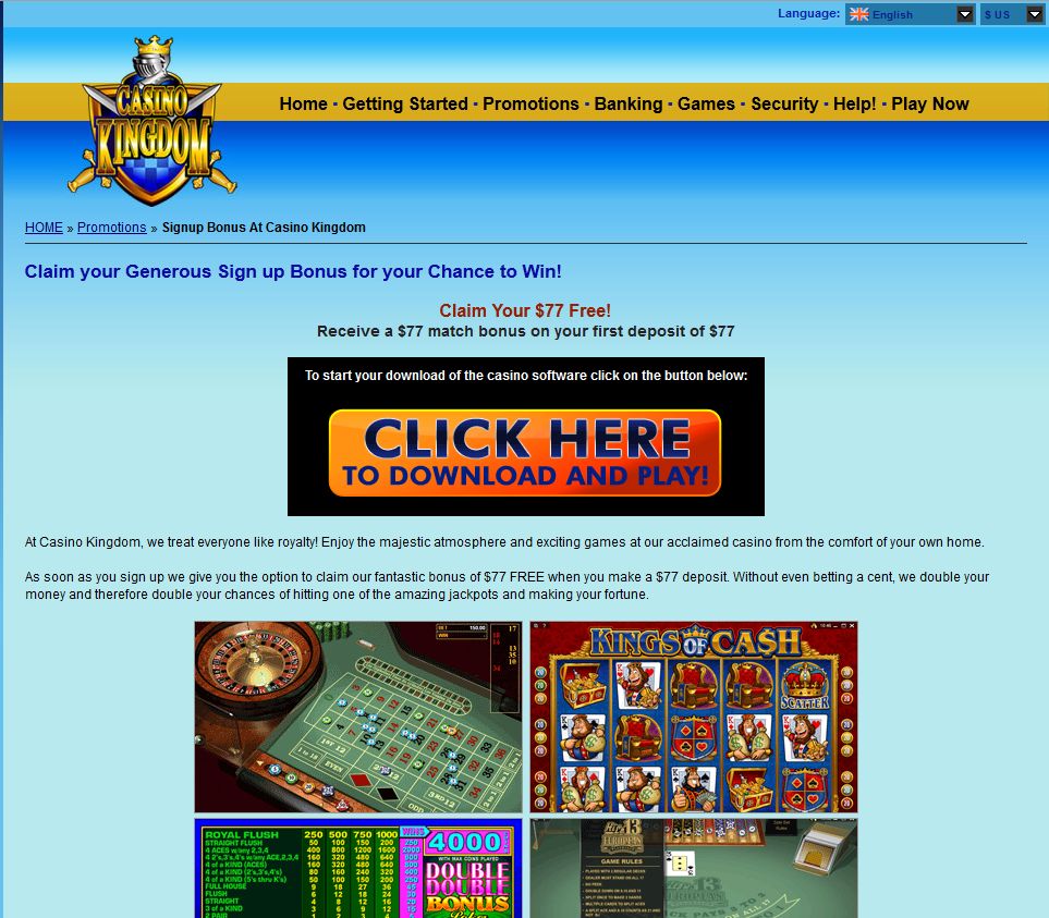 Deposit and start playing at Casino Kingdom and recieve $77 Free a tasty cash match bonus. All you need to do is deposit $77 with no need to bet and players will get $77 free.