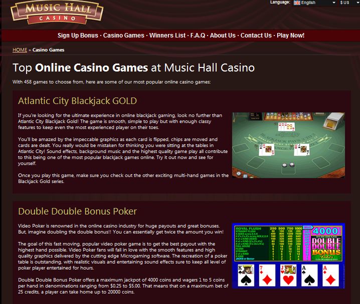 Music Hall Casino has all the latest favorite games. They really have something for everyone, whether you are a first time visitor or a truly experienced player. They are also never satisfied with their huge selection of games; there is an update every month, to ensure there is always something else to look forward to.